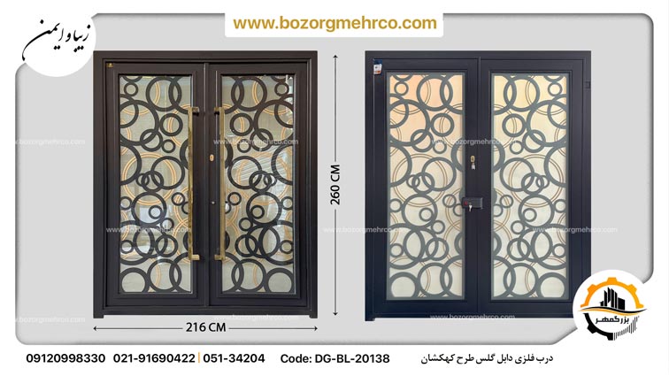 ابعاد درب دولنگه 216 در 260 سانتی متر می باشد. این محصول به قفل برقی، قفل مخفی و یا قفل ضد سرقت، ماژول اتصال قفل برقی ، دستگیره عمودی استیل طلایی مجهز شده است.