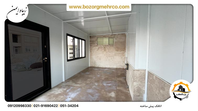 دیوارها و بدنه این اتاقک 18 متری از نوع ساندویچ پانل با ضخامت 4 سانتی متر می باشد. این محصول مجهز به فلاشینگ، قابنما و سیستم روشنایی می باشد.