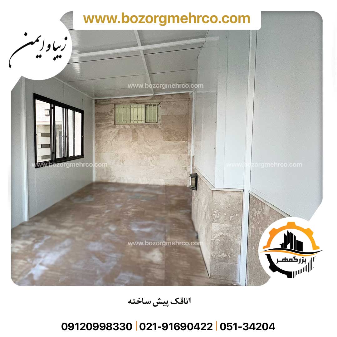 دیوارها و بدنه این اتاقک 18 متری از نوع ساندویچ پانل با ضخامت 4 سانتی متر می باشد. این محصول مجهز به فلاشینگ، قابنما و سیستم روشنایی می باشد.