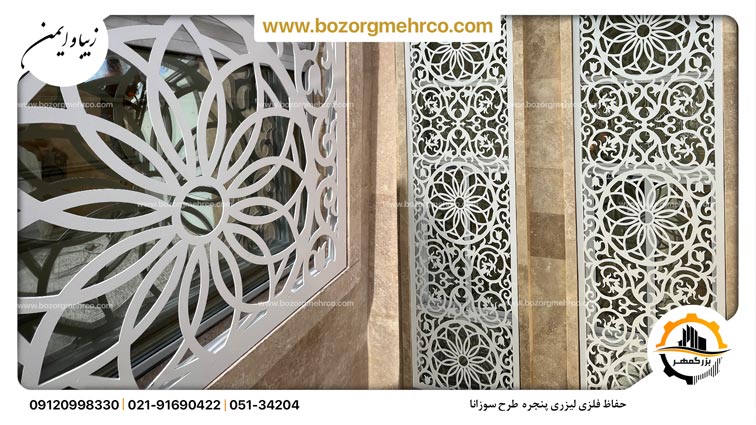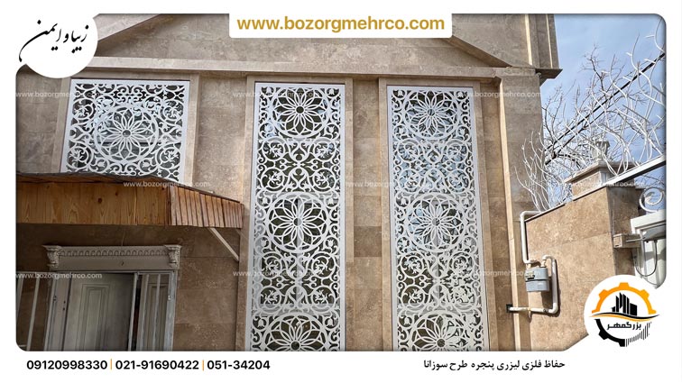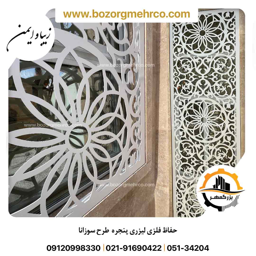 حفاظ طرح سوزانا از ورق های یک پارچه و مستحکم با ضخامت 3 میلیمتر ساخته و تولید شده است. این محصول منقش به پترن لیزری شده است و در ابعاد مختلفی طراحی و تولید شده است. تمام بخش های حفاظ فلزی با رنگ کوره ای الکترو استاتیک رنگ آمیزی شده است.