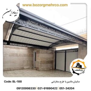 نصب سایبان حیاط و تراس فوق به همراه صفحه گذاری بر بروی دیوار انجام شده است و فرایند نصب به صورت پیچ و مهره ای می باشد. این محصول برای پارک دو خودرو مناسب است.